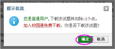 若是普通用户,系统会弹出提示框,提醒您下载试题会扣除的点数。如果您的账户中有足额的点数,请点击确定。