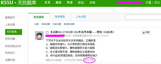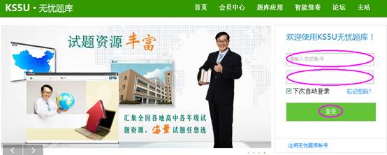 在浏览器的搜索框中输入无忧题库的网址http://5utk.ks5u.com/,进入无忧题库的首页。 1.下载网站中其他用户上传的试题 在首页的登陆框中输入用户名和密码,点击“登陆”。