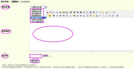使用用户名和密码登陆题库应用系统,在存在错误的试题的下部点击“纠错”,链接到试题报错页面。在试题报错页面选择试题的“错误类型”,写明具体的错误信息,输入验证码,然后点击“确定纠错”。